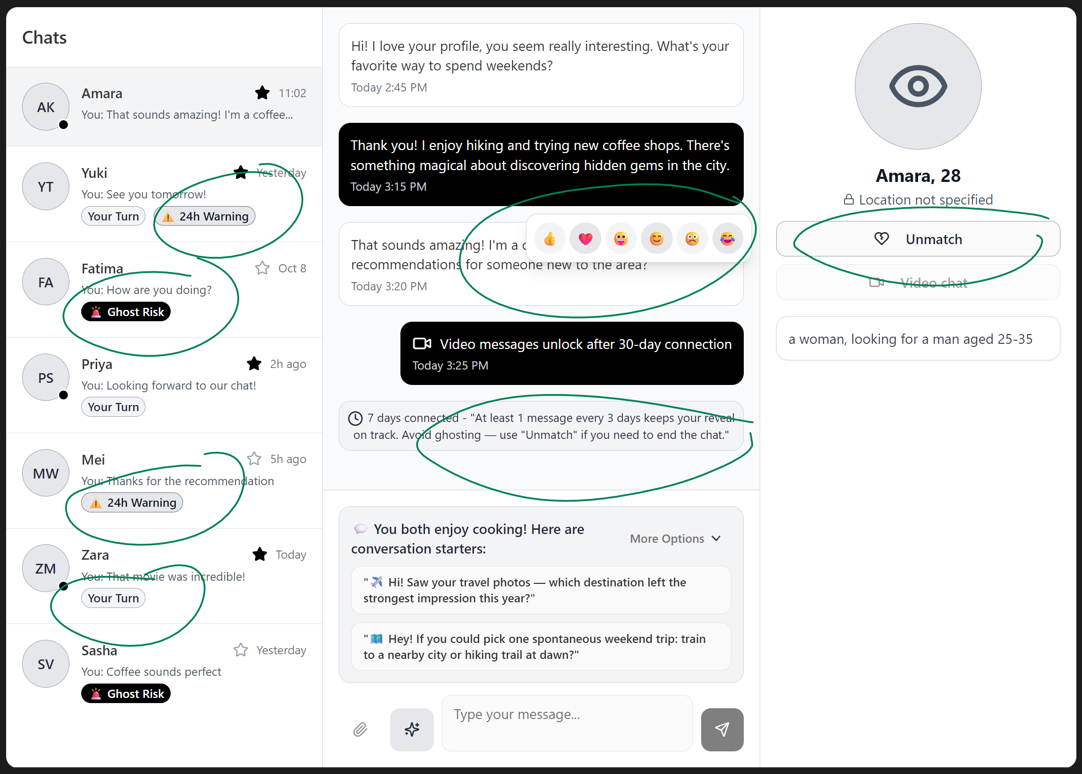 Beyond 48 hours: red "Ghost Risk" badge. At this point, users receive a notification: "Keep your conversation alive or use 'Unmatch' to end respectfully." Clear options, no judgment.